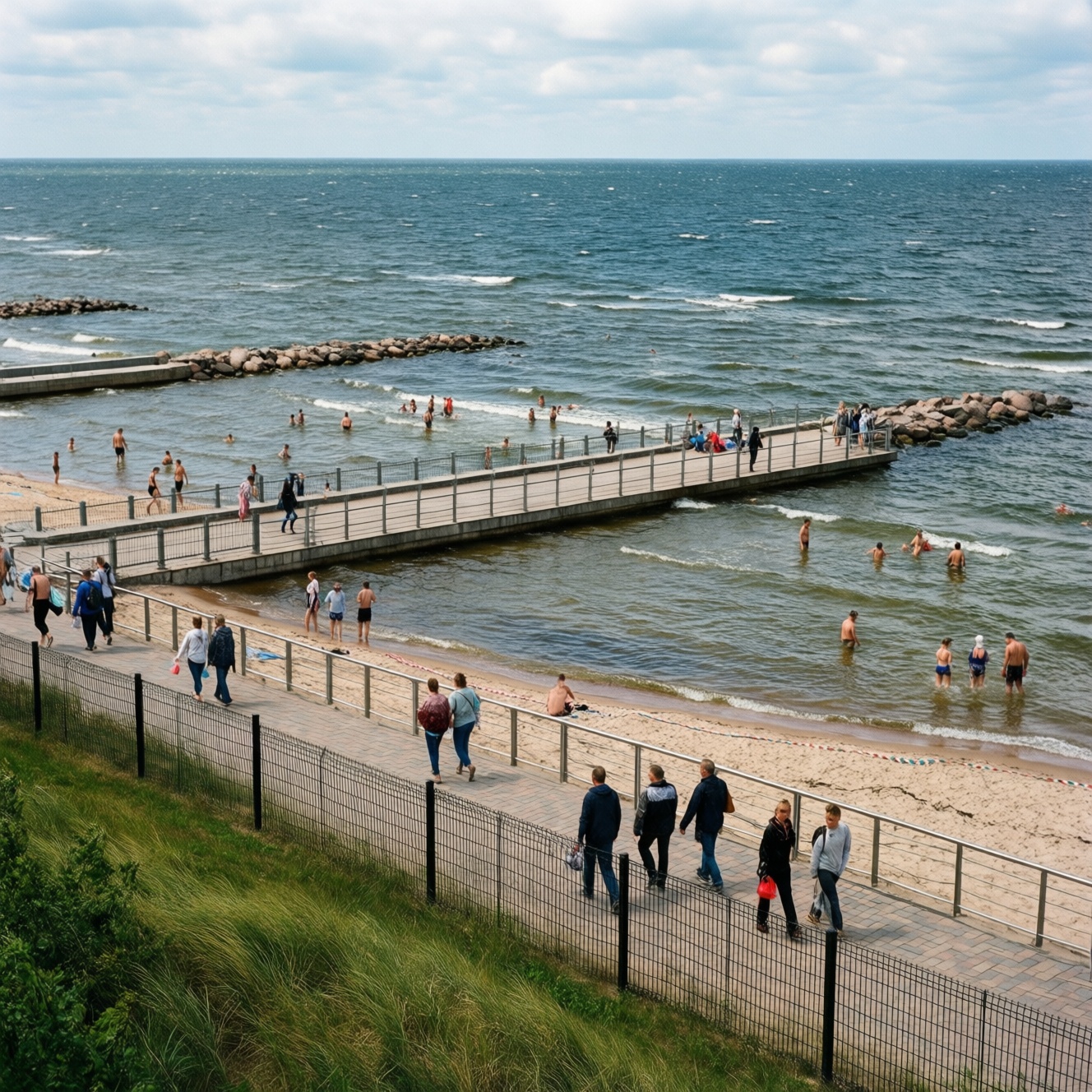 - Светлогорск пляж (участки со спусками и рядом с променадом). Чаще выбирают для прогулки и "купнуться по погоде": при сильной волне комфортнее оставаться на набережной.