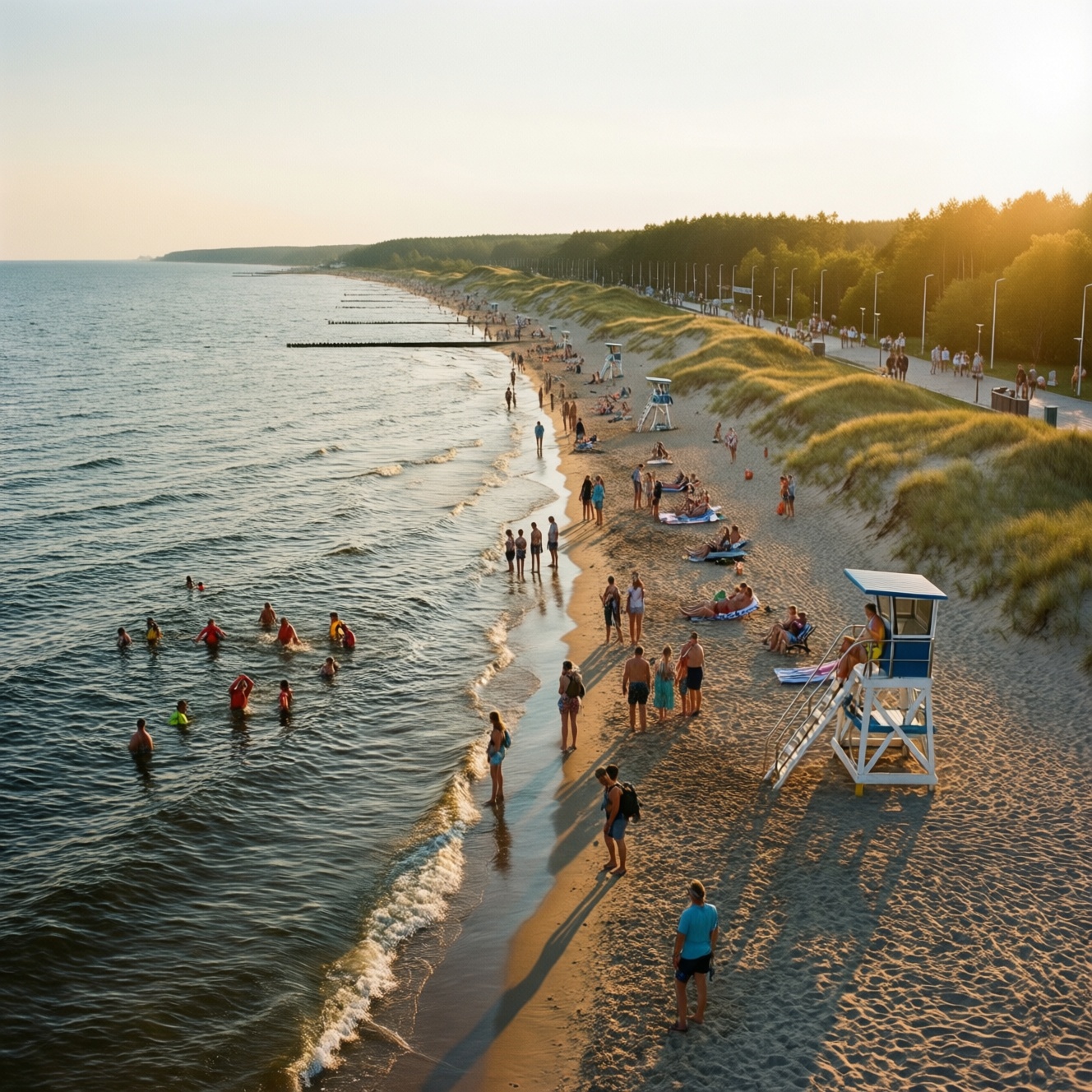 Балтийская погода капризна: даже при ясном небе вода и ветер могут быть "непляжными". Для купания выбирайте дни без сильного ветра и с устойчивым прогнозом, а для прогулок подходят почти любые условия, если есть ветровка. Не стоит планировать дальний выезд ради купания при штормовом предупреждении и при красных флагах на берегу.