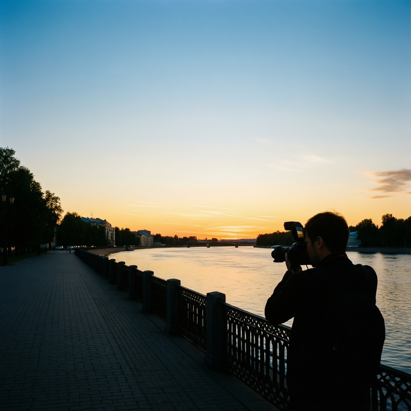 Для "линий в кадре" удобно работать у Медового моста: перила и ось набережной помогают собрать композицию, а в "синий час" включается городская подсветка.